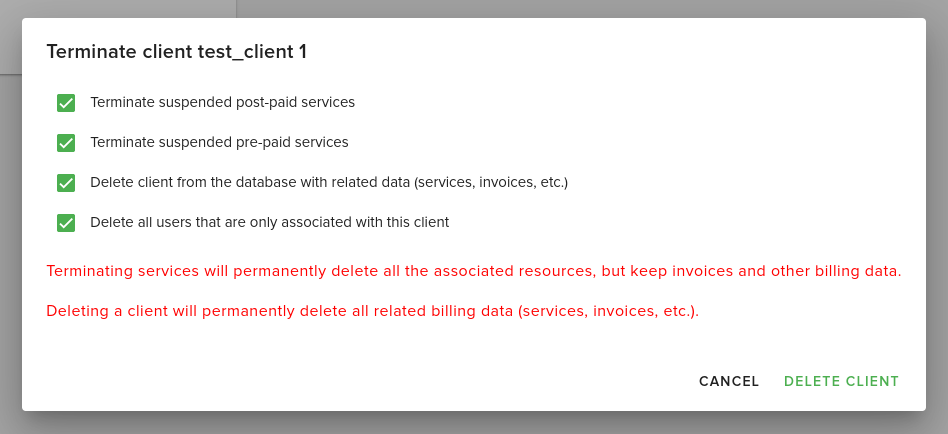 The “Delete client” action has been removed and its functionality was included into the “Terminate client” action button.