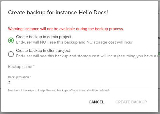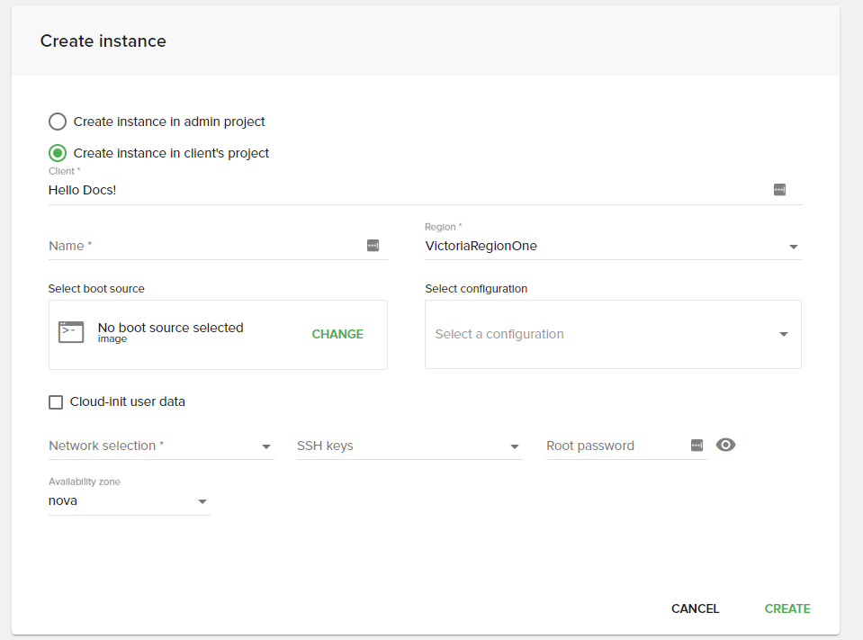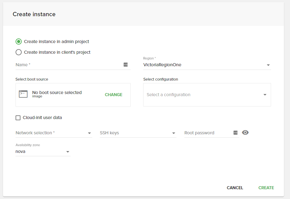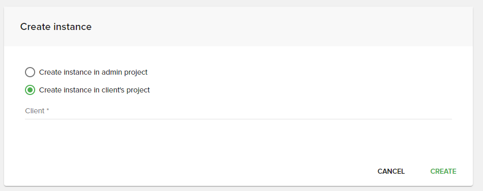 As you can see, you can chose to create the instance either in the admin project, or in a client’s project.