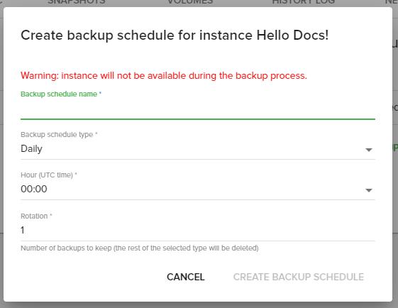 As you can see in the previous picture, you will be able to create a new backup schedule by clicking on the Create new backup schedule button. This will open the following form: