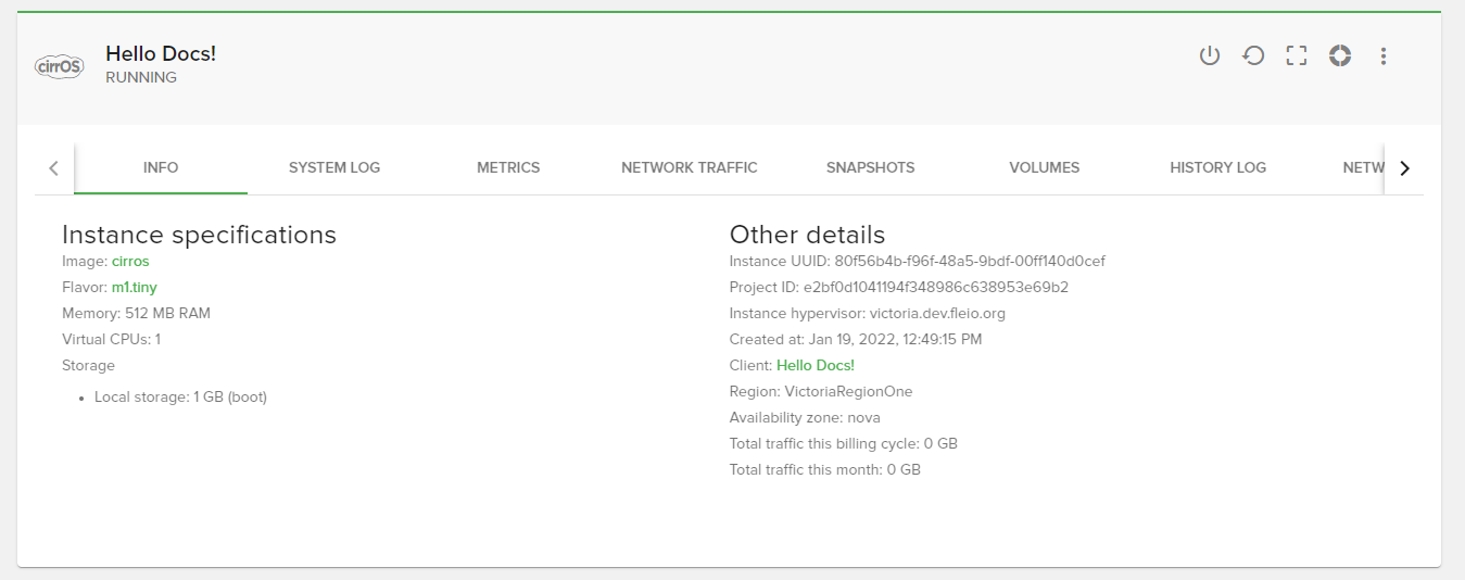 other details (instance UUID, project ID, instance hypervisor, created date, client, region, availability zone, total traffic this billing cycle, total traffic this month)