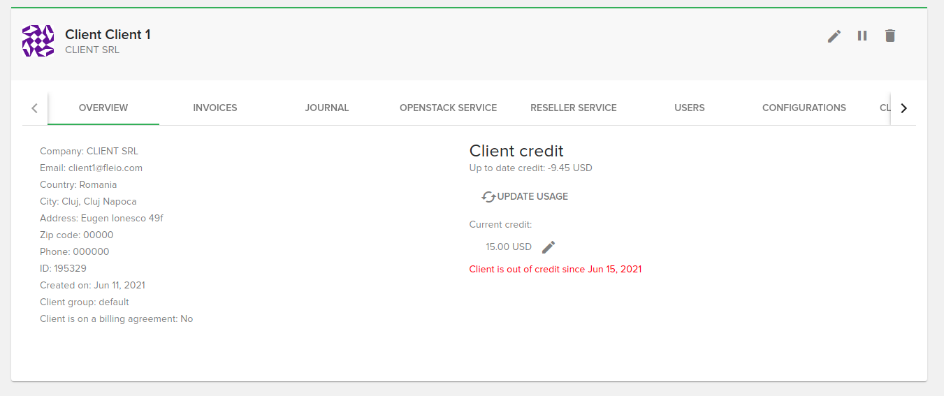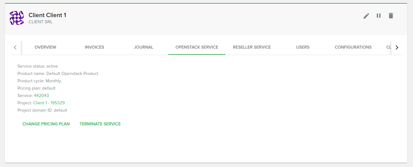 On the OpenStack service tab you can manage the client’s OpenStack service. If there’s an existing service then you will see the following details: