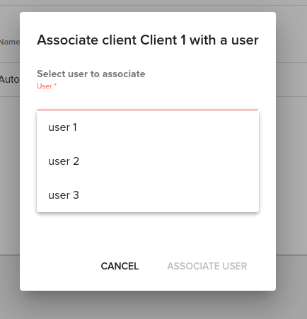 To associate a new user you need to click on the “Associate user” button, and select a new user from the available ones.