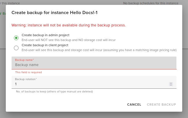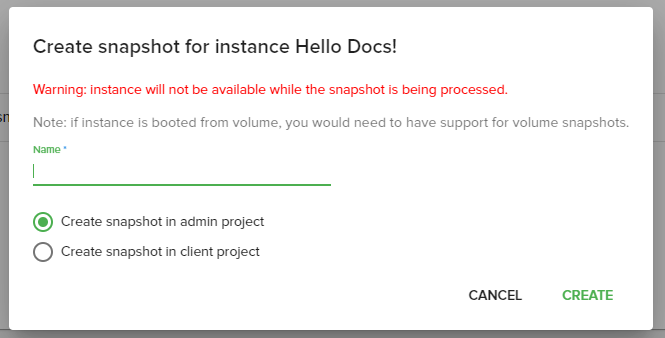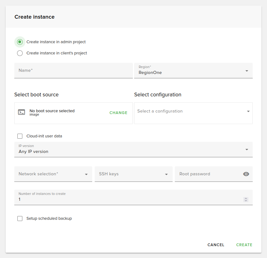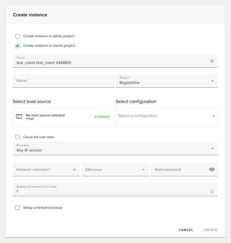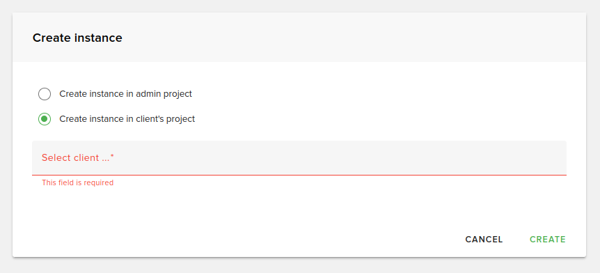 As you can see, you can chose to create the instance either in the admin project, or in a client’s project.
