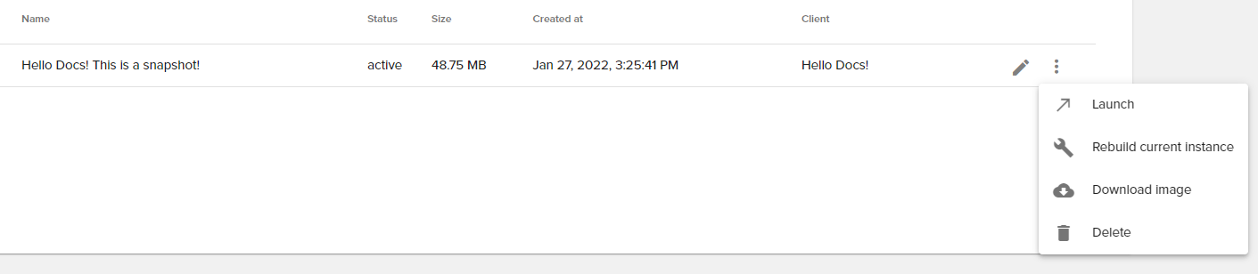 To edit/launch/rebuild current instance/download/delete snapshot you need to use the action buttons available on each snapshot row:
