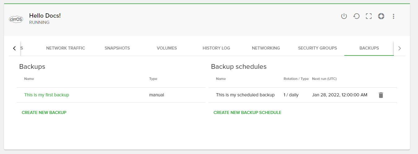 Show floating IP checkbox on instance createis selected in region settings, this checkbox is available. After being checked the user further selects theFloating IP networkwhich will be used to automatically create a floating IP after the instance becomes active. The automatically created floating IP will then be auto-assigned to the corresponding port on the instance.Setup scheduled backup: When enabled, it allows clients to define a backup schedule for the new instance.