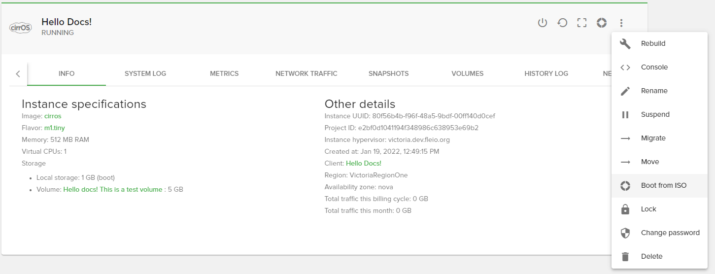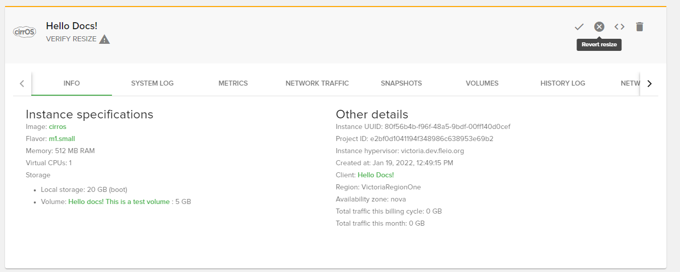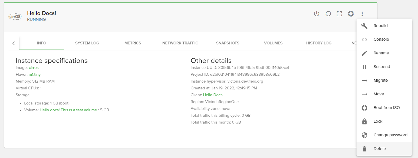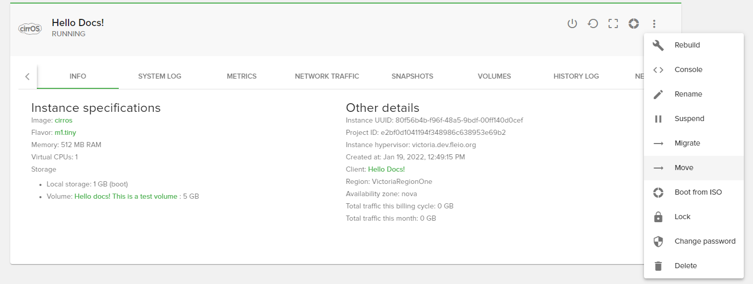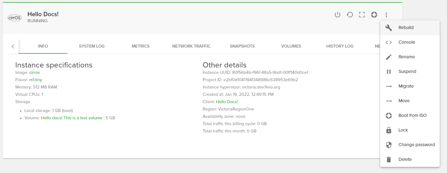other details (instance UUID, project ID, instance hypervisor, created date, client, region, availability zone, total traffic this billing cycle, total traffic this month)