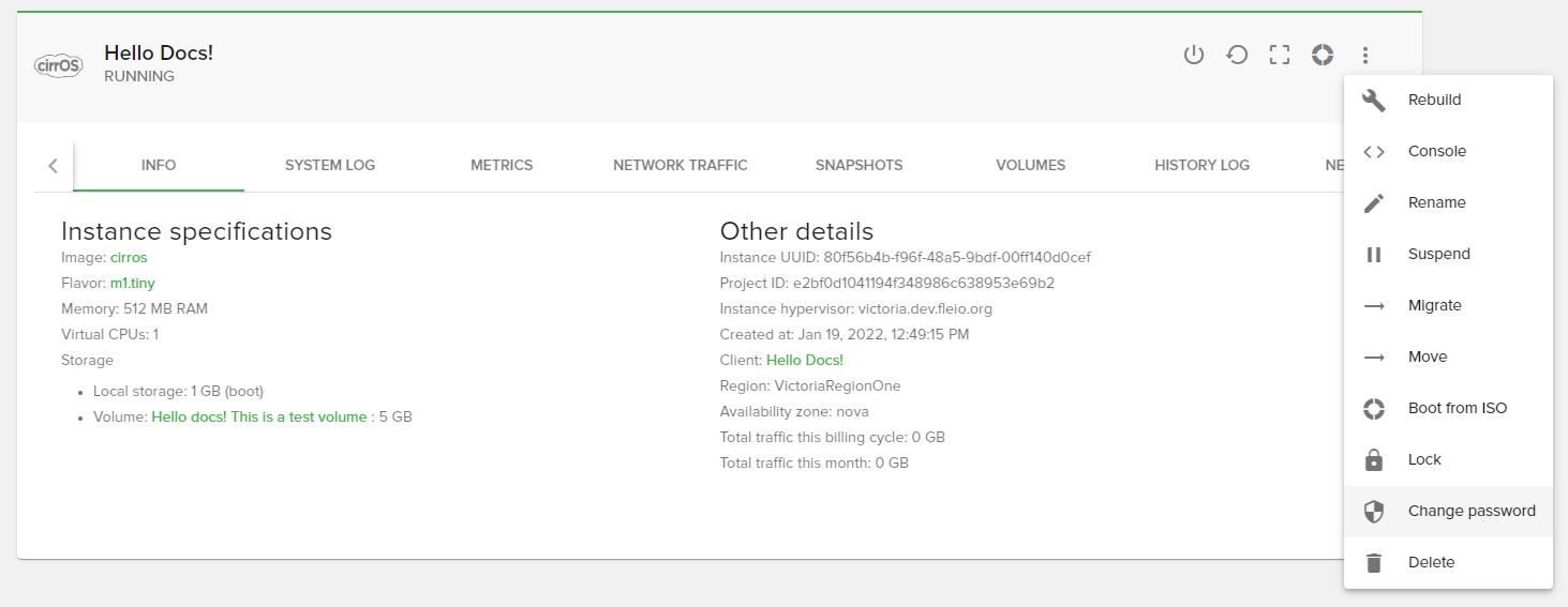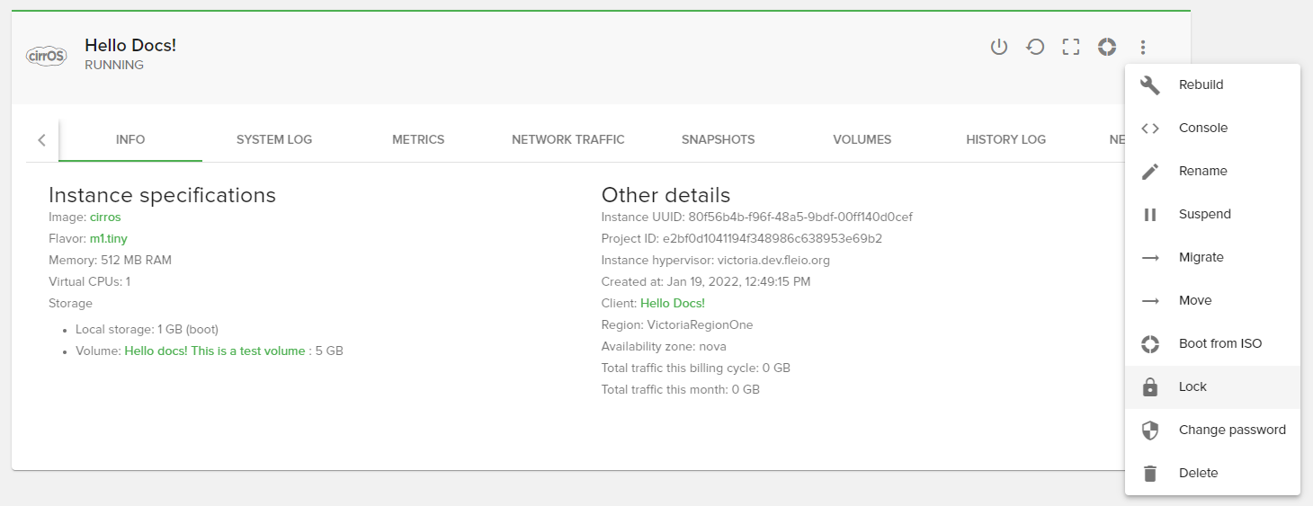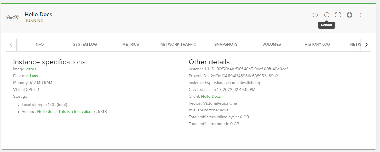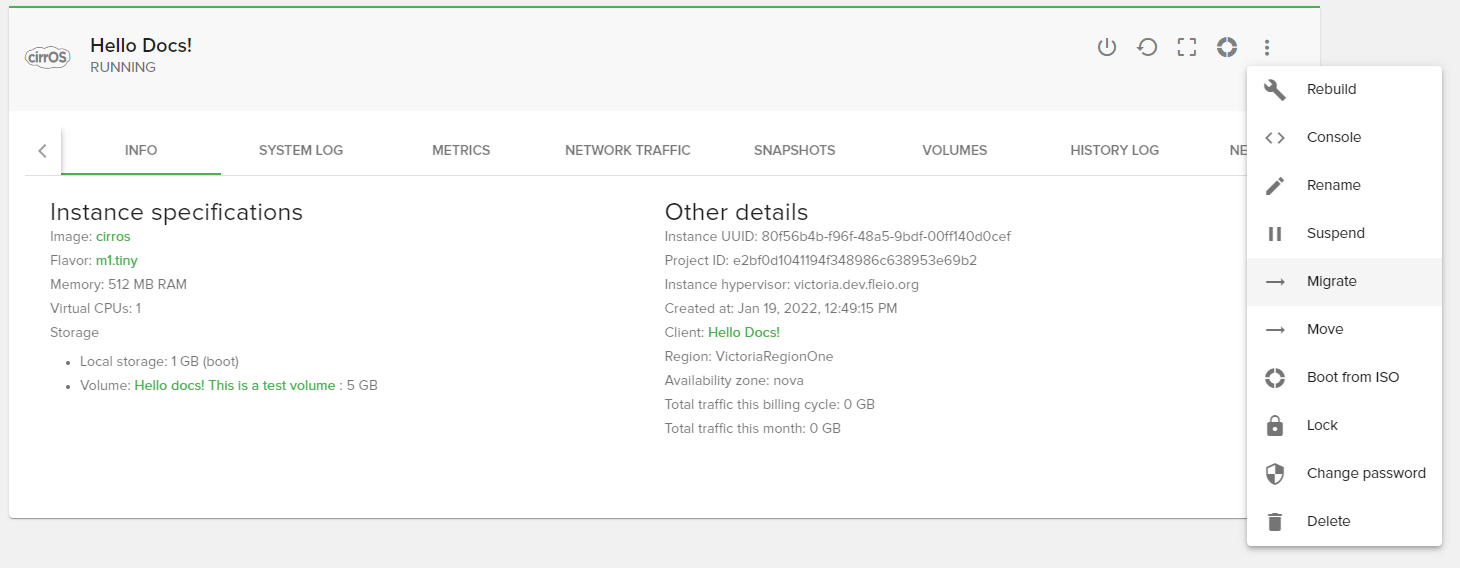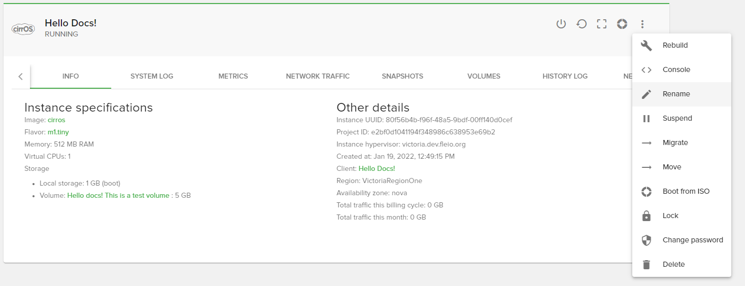 other details (instance UUID, project ID, instance hypervisor, created date, client, region, availability zone, total traffic this billing cycle, total traffic this month)
