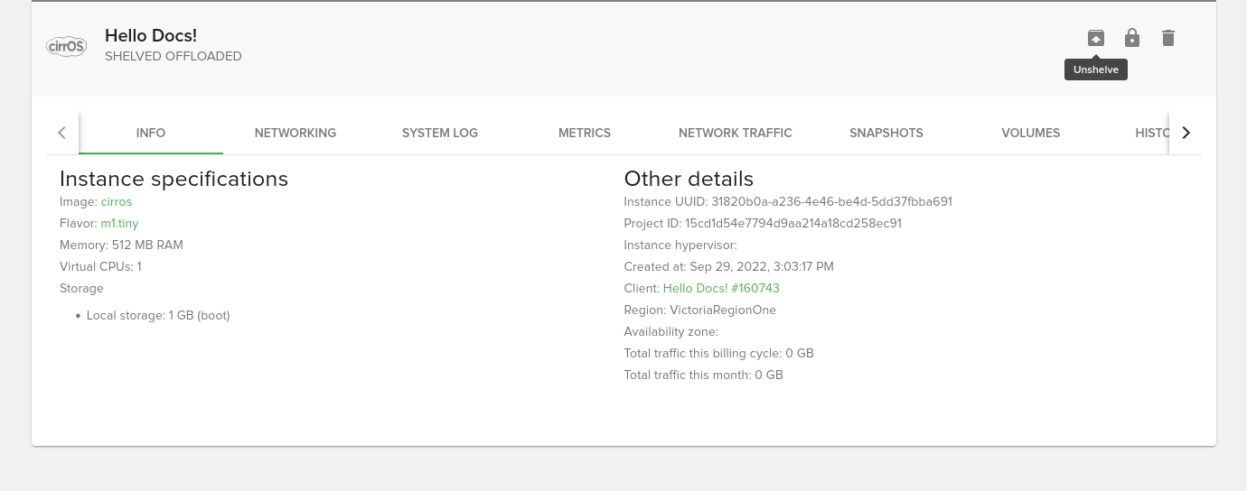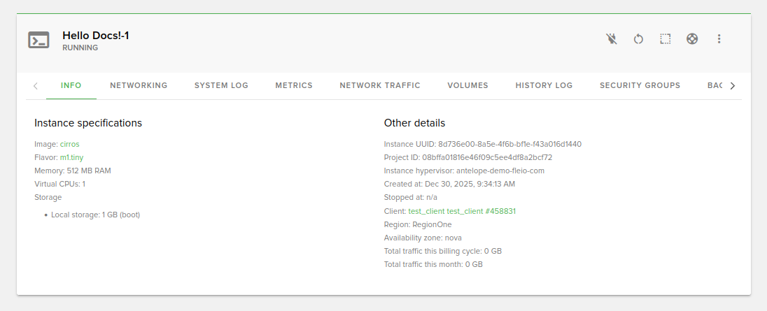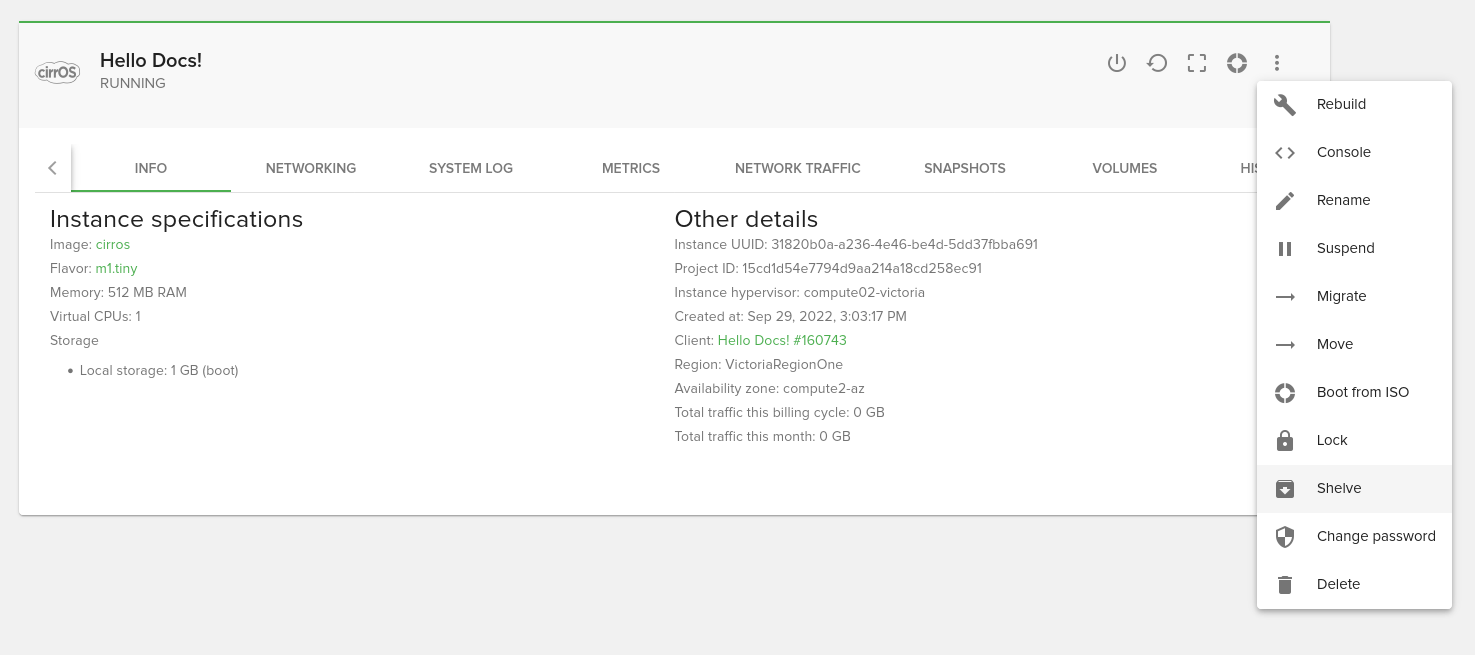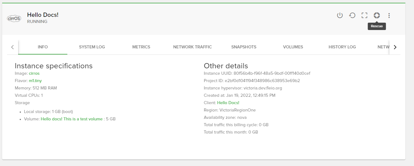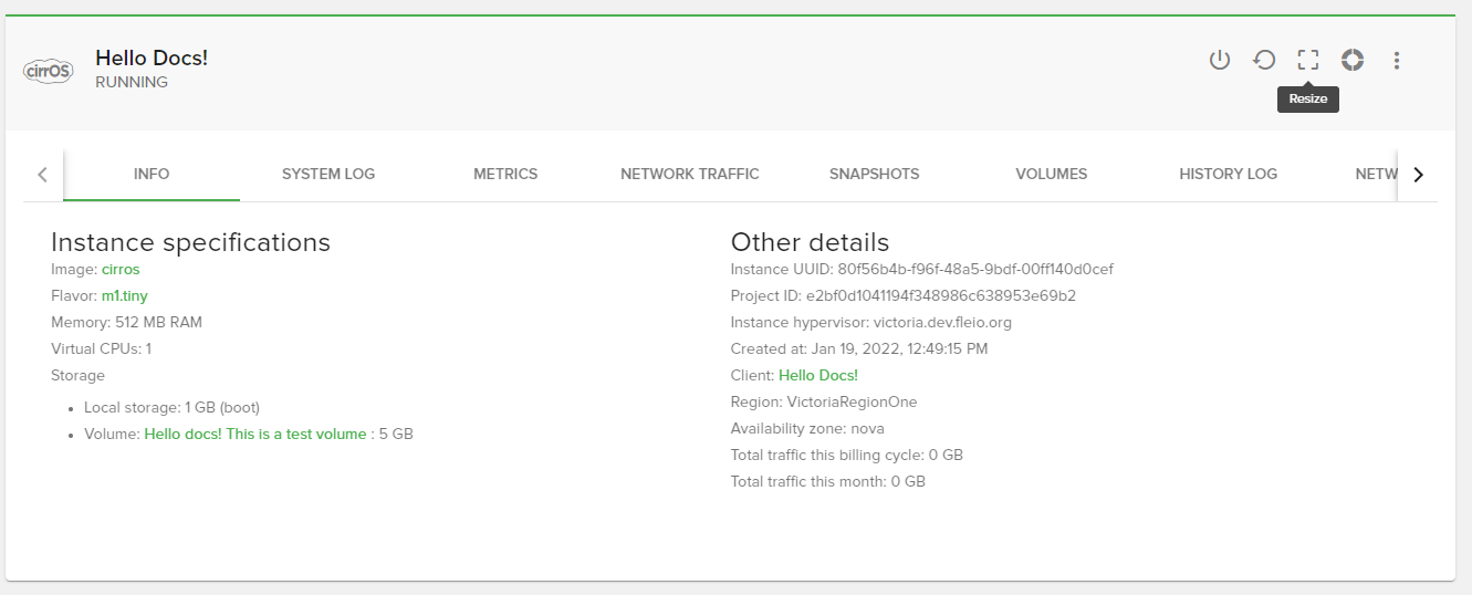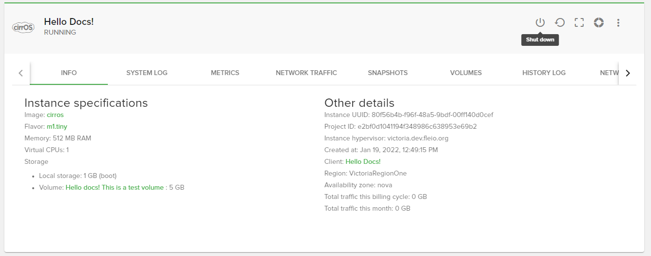 other details (instance UUID, project ID, instance hypervisor, created date, client, region, availability zone, total traffic this billing cycle, total traffic this month)