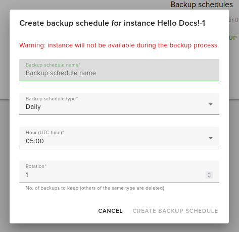 As you can see in the previous picture, you will be able to create a new backup schedule by clicking on the Create new backup schedule button. This will open the following form: