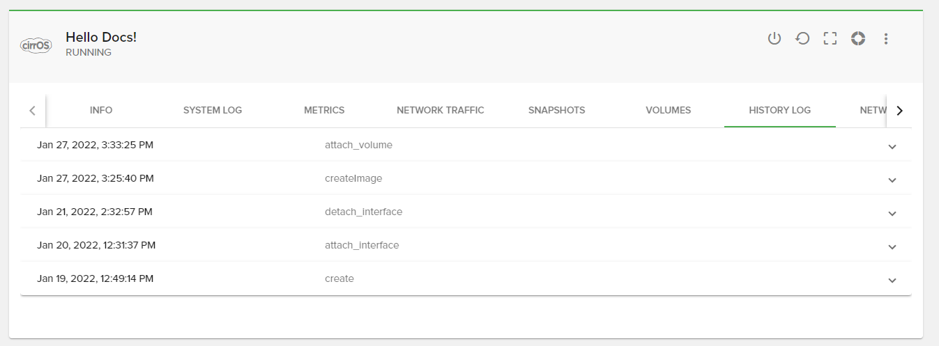 On the history log tab, you will be able to see the actions that were done to this instance, such as the following:
