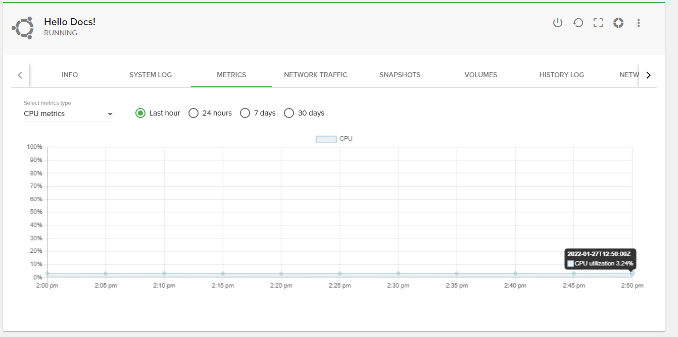 On the metrics tab, you will be able to see the network metrics and the cpu metrics: