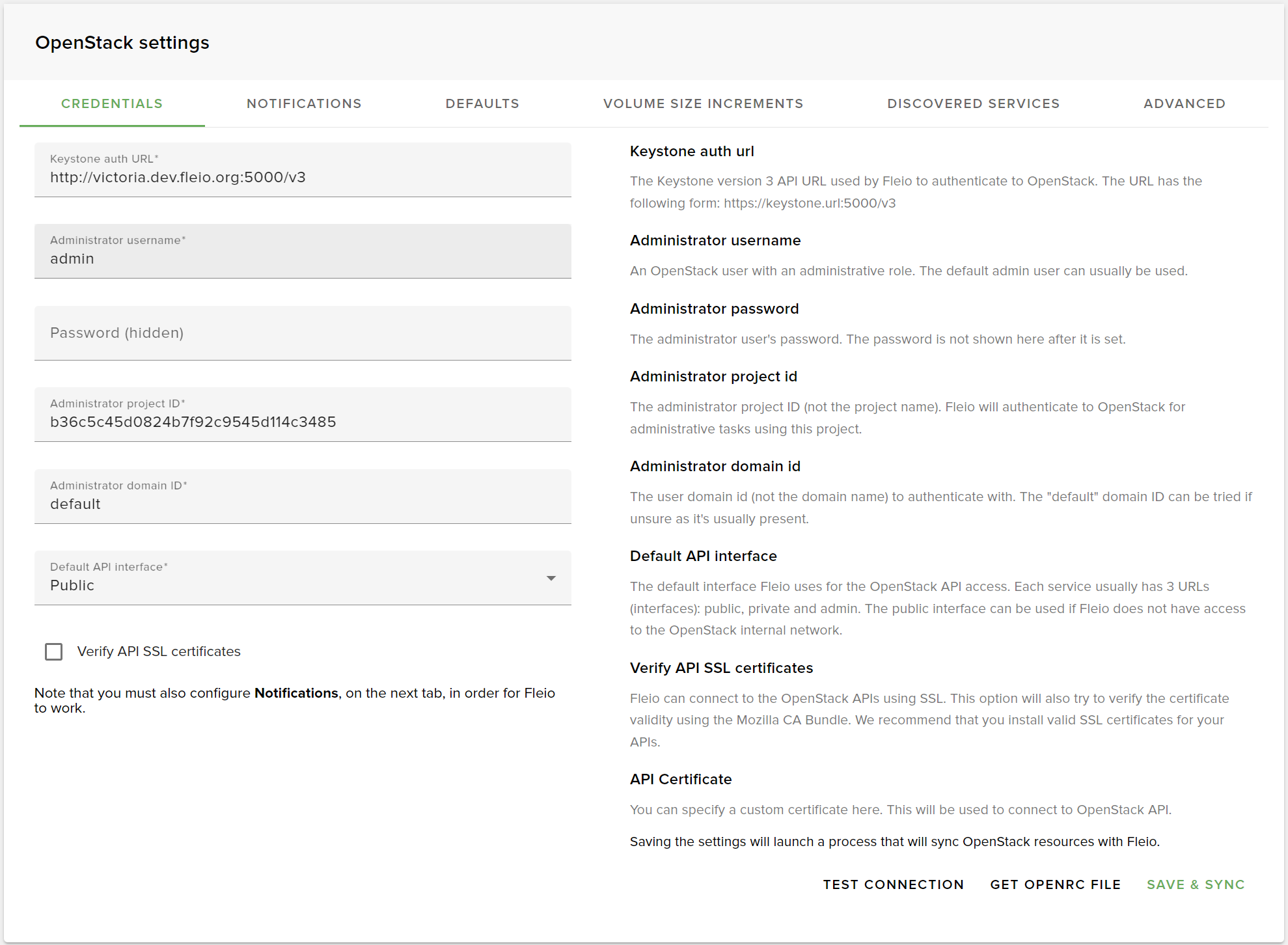 To connect Fleio to OpenStack you need to configure CREDENTIALS, NOTIFICATIONS, and possibly DEFAULTS.