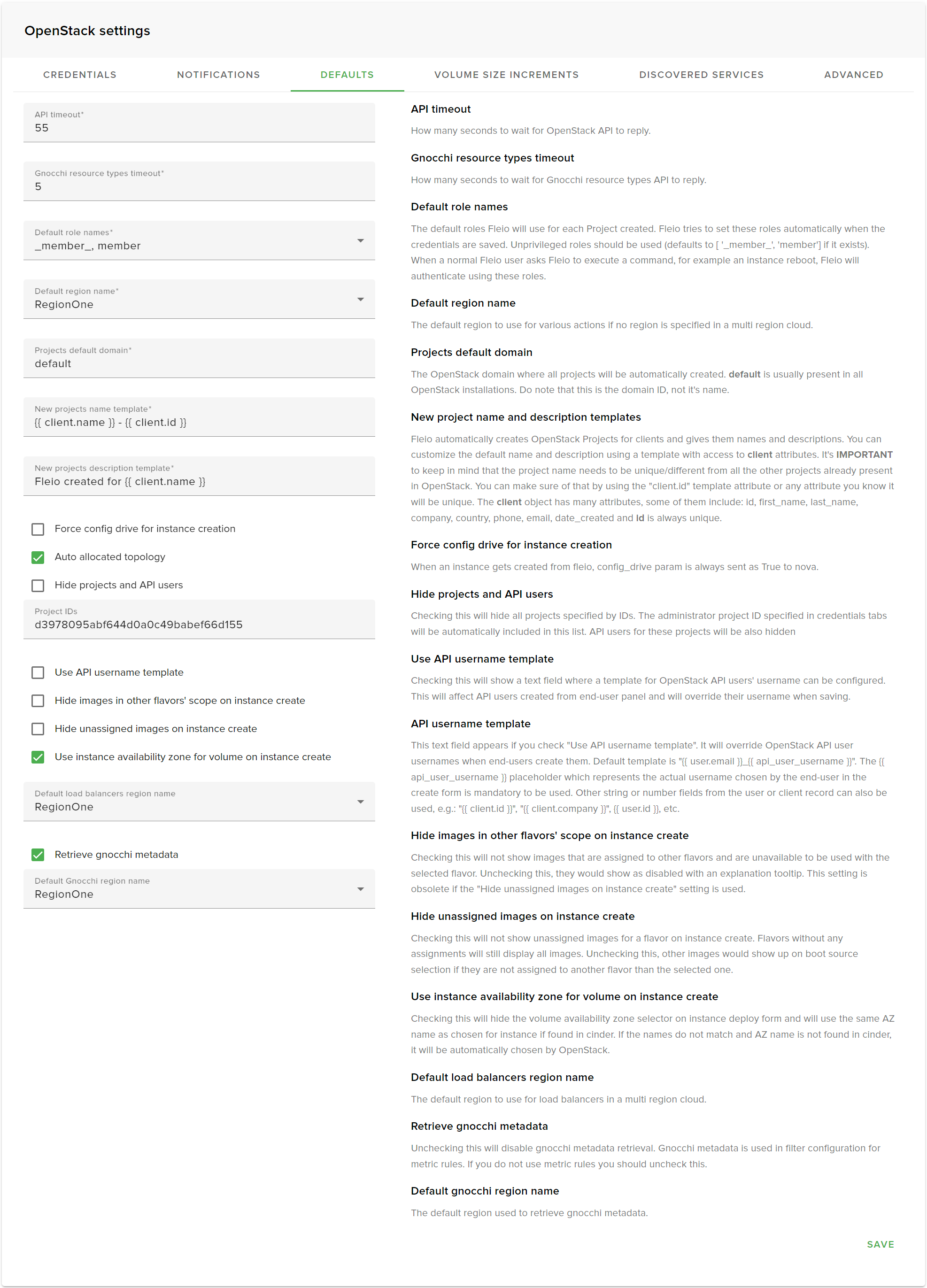 Fields New projects name template and New projects description template are template strings used when projects are automatically created when a new client is created (through end-user sign-up or by staff users). Note that the project name has to be unique, otherwise OpenStack project creation fails.
