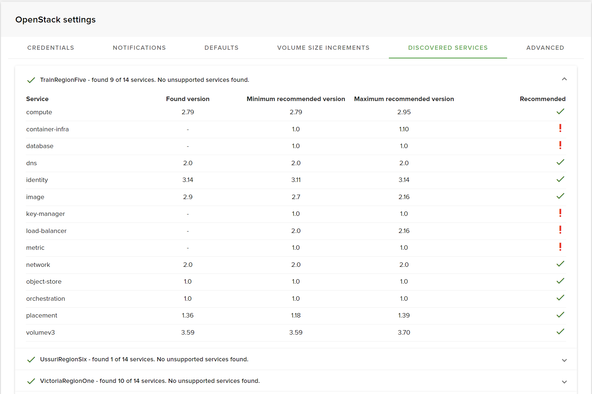 The DISCOVERED SERVICES tab lists all discovered services grouped by region and weather they are supported by Fleio along with minimum and maximum supported version. If an OpenStack service is not found (e.g., load-balancer) or if the service version is not supported, a red exclamation mark is shown next to the service.