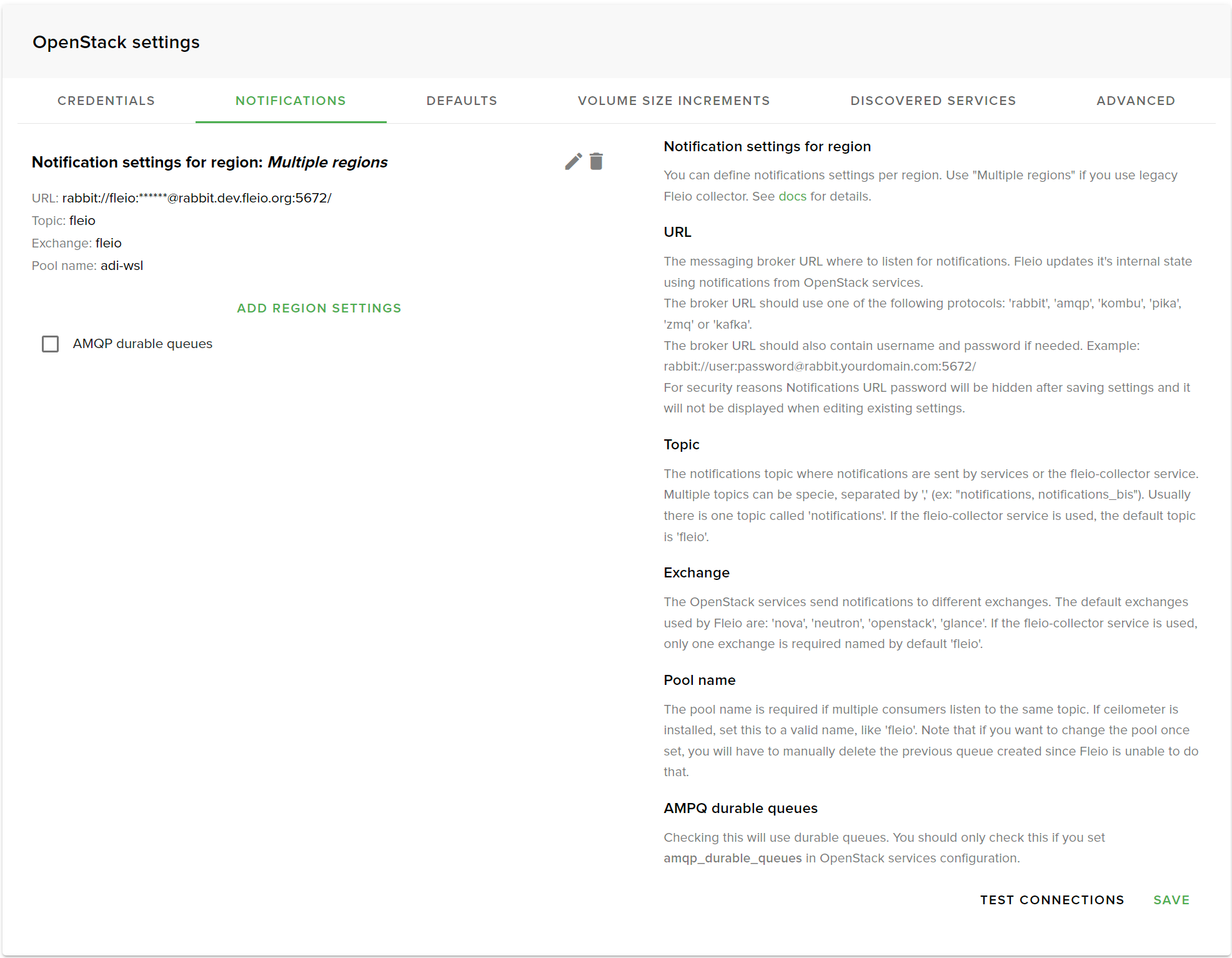 For each region you can configure one or more RabbitMQ URLs. When Fleio receives a notification it assigns the region associated with that URL to the notification.