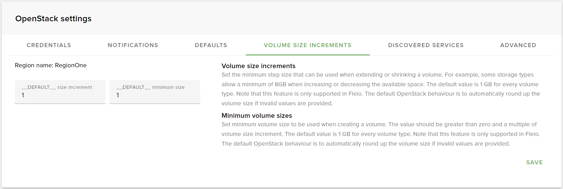 Using this form, you can define a minimum size and allowed size steps for each type of volume from each region. The default value is 1 GB for every volume type.