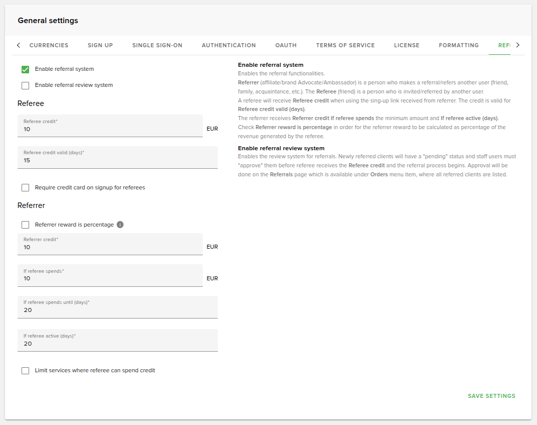 A referee will receive Referee credit when using the sing-up link received from referrer. The credit is valid for Referee credit valid (days).
