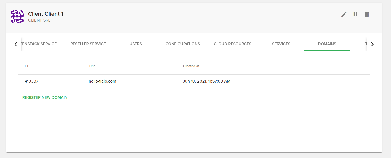 On the domains tab you will be able to see the client’s domains, with the following details: