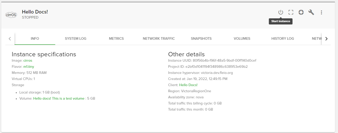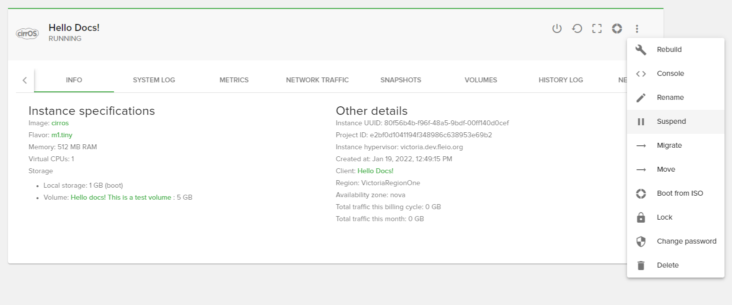other details (instance UUID, project ID, instance hypervisor, created date, client, region, availability zone, total traffic this billing cycle, total traffic this month)